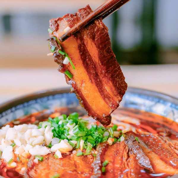 太和板面是安徽省阜阳市太和县的一道特色面食,因为这道面是在案板上摔打而成,所以得此名,给人第一印象就是浓汤宽面,臊子红亮,绿的菜叶,散发着诱人的香味,令人食欲大开。