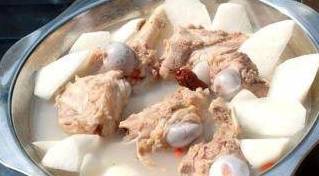 材料:排骨500克、茭白5条、香菇4朵、红萝卜1条、姜3片、葱1条、水8碗。