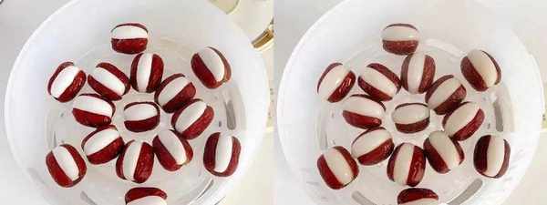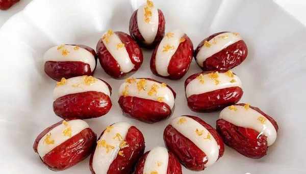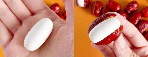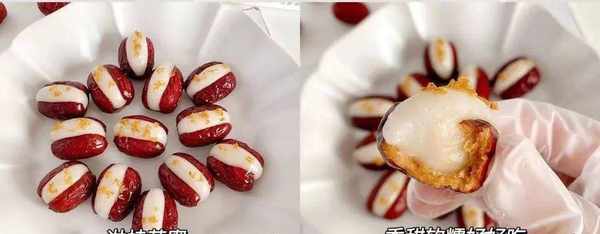 3、将糯米面团搓成茧型,然后塞入红枣中。