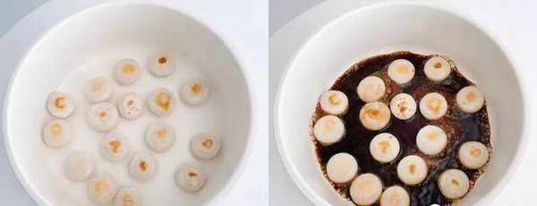 2、做好的糯米小圆饼,热锅放油,放在锅中煎到双面焦黄色,然后倒入一碗红糖水(用两块红糖加一碗水融化)。