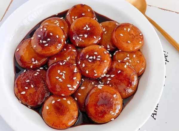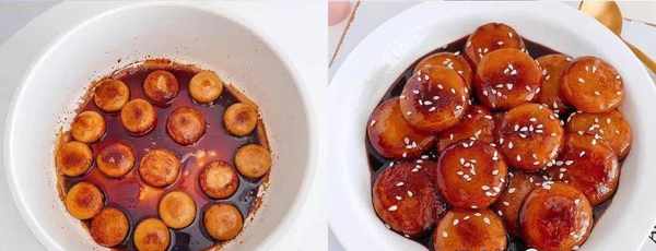 3、用小火将红糖水煮沸,吸入糯米糍粑中,煮2分钟起锅,再撒上芝麻就完成了。