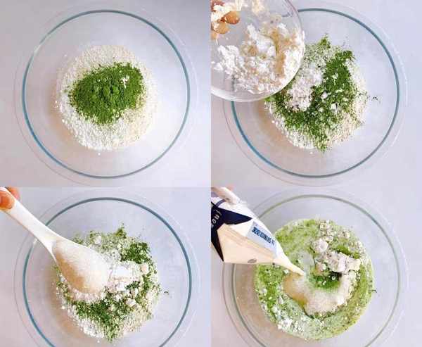 1、准备小半碗糯米粉,放一勺抹茶粉混合,再倒入一盒纯牛奶搅拌。