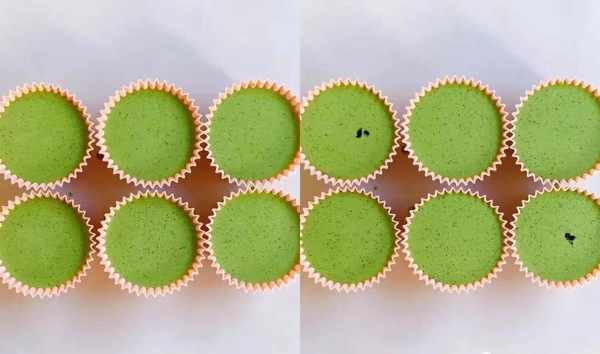 3、将搅拌好的抹茶面糊,倒在模具中,再中间放入一些提前煮熟的红豆。然后上锅蒸15分钟就完成。