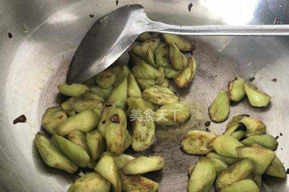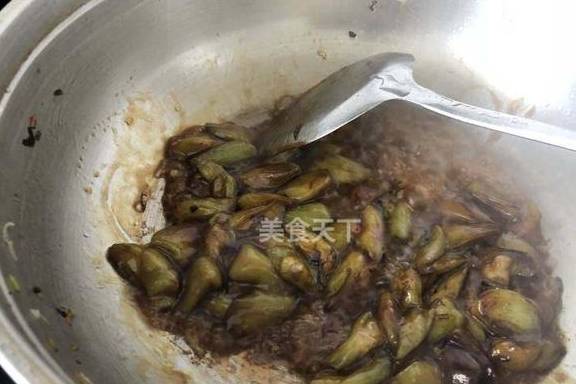 5.放入茄子翻炒至茄子表面略微焦黄。