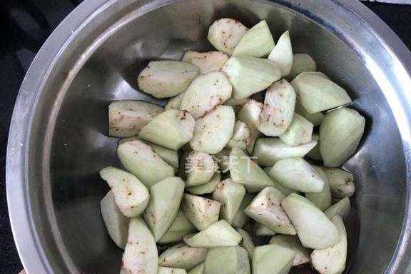 1.茄子去皮切成滚刀块,放入一勺盐搅拌均匀,腌渍20分钟,盐会杀出很多水。
