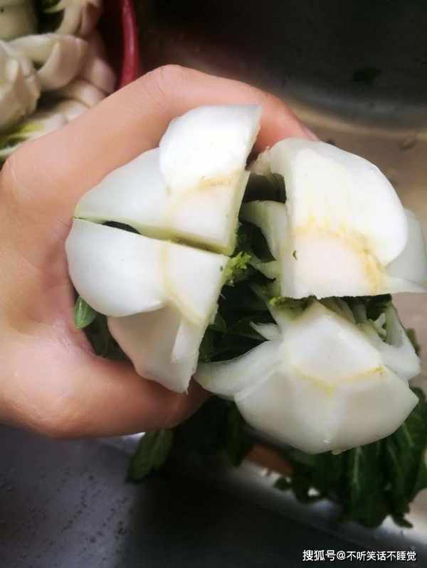 2、把老梗叶子摘掉,然后把大棵的对半切开,或者切成四半,目的是缩短焯烫的时间,还能加速晒干水分。