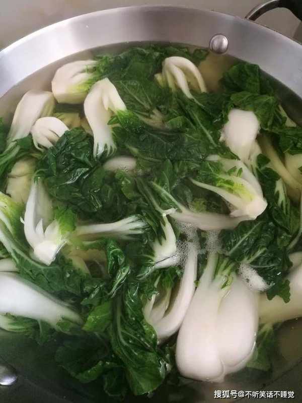 3、水烧开后下白菜焯烫,不要烫太熟,菜烫至6分熟即可捞起,马上放进凉水中,让白菜迅速降温。
