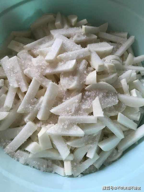2、将洗好的白萝卜用刀切成条状,切粗一点儿吃的时候有嚼劲儿,撒入食盐,搅拌均匀,这一步是为了去萝卜里的苦涩味道,腌出水分更容易晾晒,吃的时候也比较爽脆。