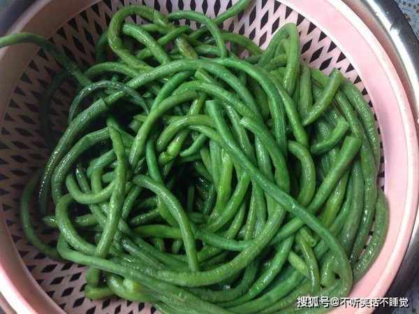 3、烫至变色后,马上捞出豇豆,控干水分。