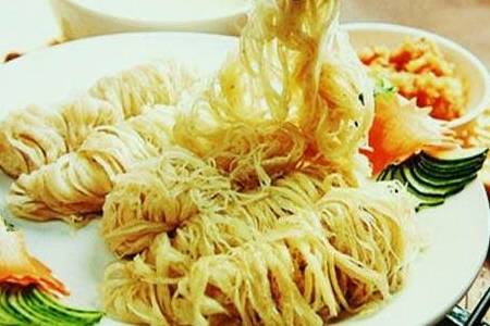 4,羊肉泡馍简称羊肉泡、泡馍。古称"羊羹",西北美馔,尤以陕西西安最享牛羊肉泡馍盛名,北宋著名诗人苏轼留有"陇馔有熊腊,秦烹唯羊羹"的诗句。它烹制精细,料重味醇,肉烂汤浓,肥而不腻,营养丰富,香气四溢,诱人食欲,食后回味无穷。因它暖胃耐饥,素为西安和西北地区各族人民所喜爱,外宾来陕也争先品尝,以饱口福。牛羊肉泡馍已成为陕西名食的“总代表”。