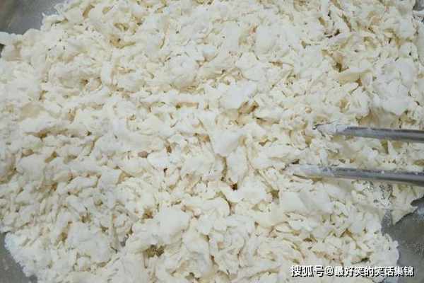 4、盆中倒入250克中筋面粉,用含有酵母粉的温水,边倒边搅动,让面粉吸收水分,一直搅出面絮的样子,如图所示。
