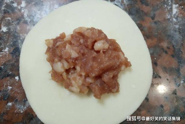 7、取出一个包子皮,舀入适量的肉馅,捏紧收口,包成小包子的形状,别管美观不美观,记得别露馅就行。