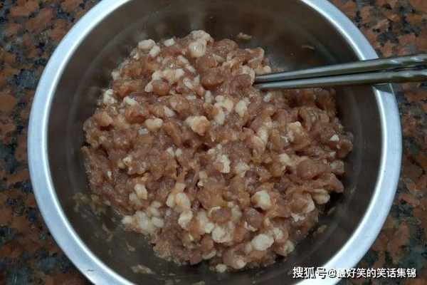 2、准备250克前腿夹心肉,三分肥七分瘦,自己在案板上剁碎,调味:加2克食盐,老抽5克,生抽5克,蚝油8克,白糖3克,芝麻香油2克,分5次打入60克葱姜水,每次搅打至肉馅把水分完全吸收后,再次加入,全部完成后,放入冰箱冷藏30分钟腌制。