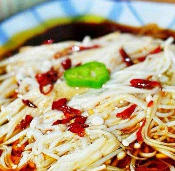 6)锅中烧热油,有些冒烟的时候关火淋在金针菇上即可食用。