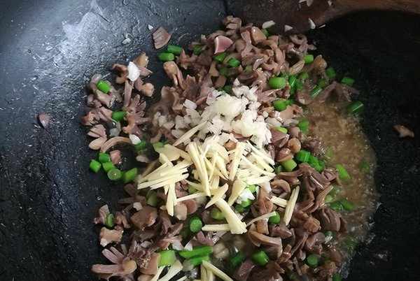 8、炒至鸡胗变色后加入蒜苔、生姜、大蒜一起继续爆炒1分钟。