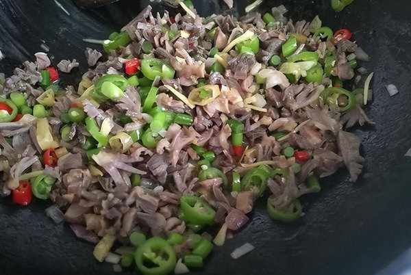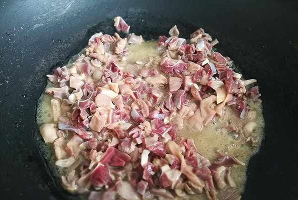 7、锅中加入适量的食用油,油热后将腌制好的鸡胗倒进锅中大火翻炒。