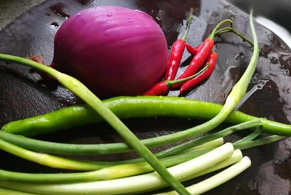 4、准备少许配菜,例如洋葱、青红椒、蒜苔和小葱等。
