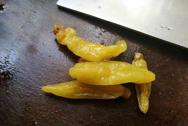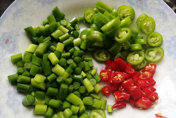 6、把泡椒也切成小段备用,再准备些生姜大蒜即可。