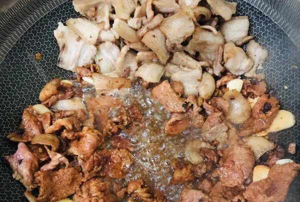 3.炒肉片:锅中放少许底油,下入五花肉煸炒出油脂,有点焦的甘娟,再放入瘦肉滑至断生,下蒜片和豆豉炒香,淋少许料酒去腥味;