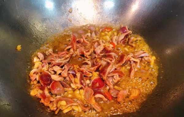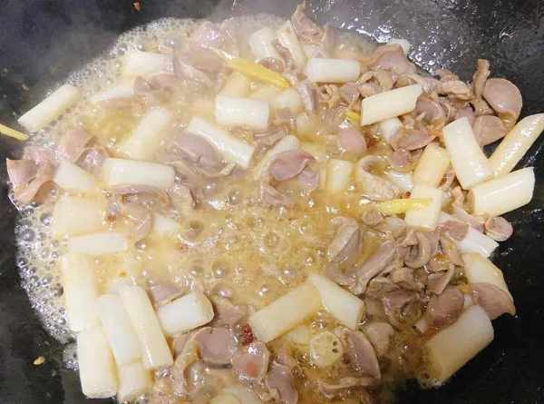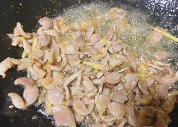 5.姜蒜爆香后,加入腌制好的鸡胗爆炒出香味,炒至鸡胗断生;