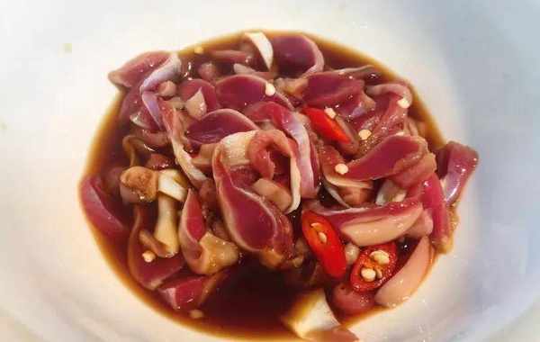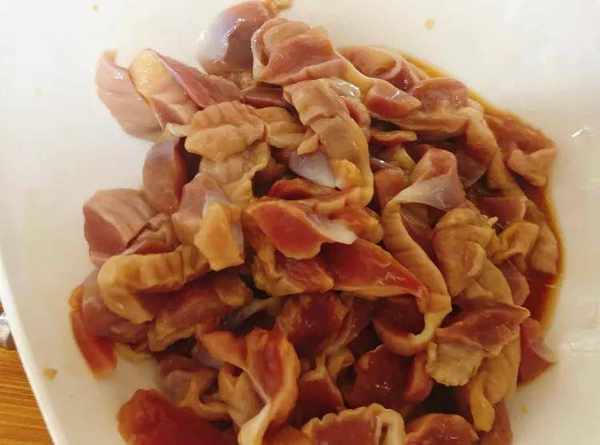 1.处理鸡胗:鸡胗处理干净,用盐水浸泡15分钟后捞出,切成薄片容易入味;