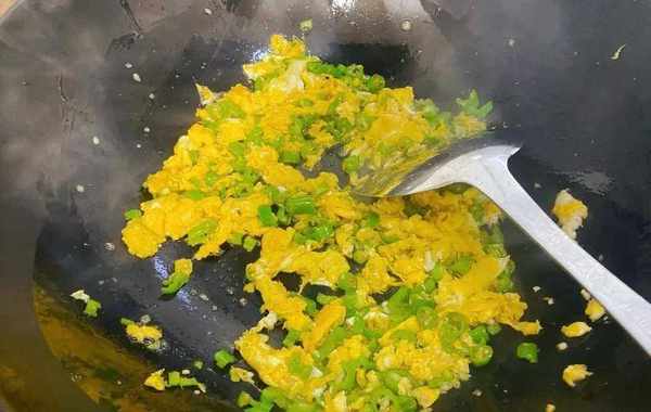 3.鸡蛋炒好后不要盛出来,加入切碎的青椒翻炒20秒左右;