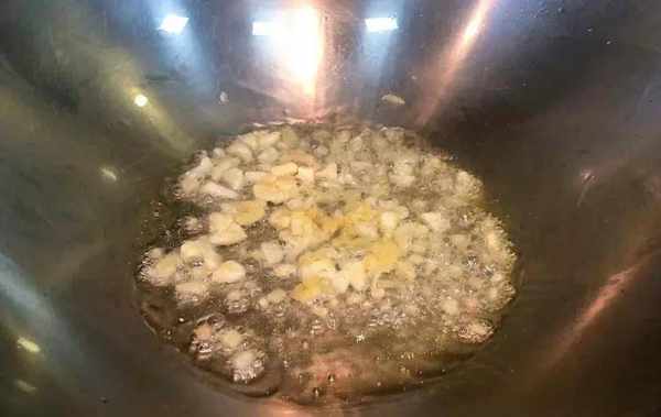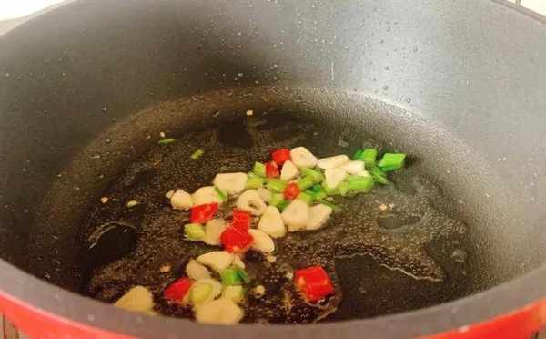 4.爆香姜蒜:起锅热油,用猪油更香,油温7成热时下入姜蒜末爆香,至香味四溢;