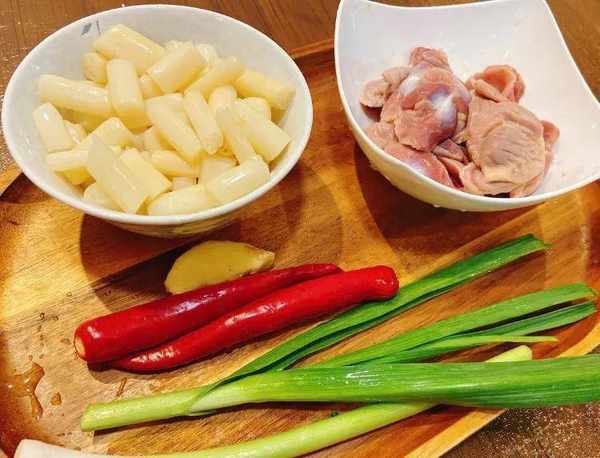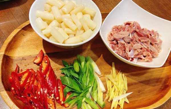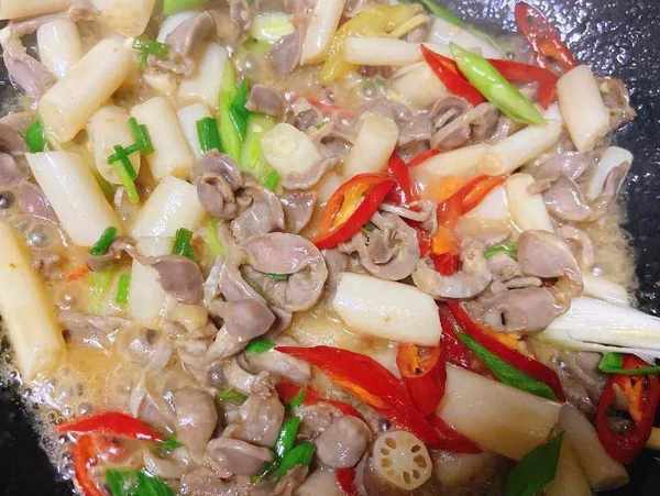 食材:泡藕带、鸡胗、红辣椒、蒜苗、生姜