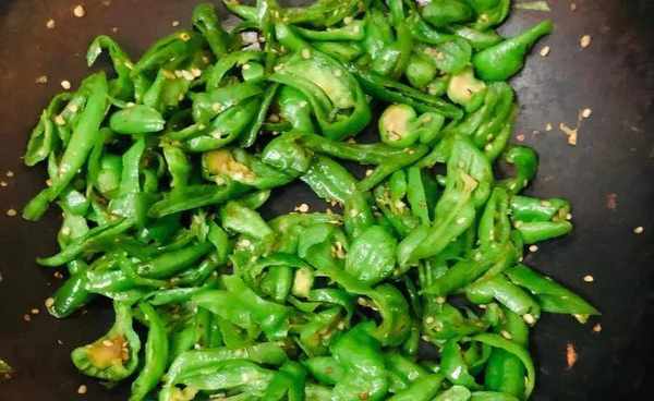 2.炒螺丝椒:锅烧热不放油,先把螺丝椒擂至断生,辣椒表皮变白,虎皮状更好,盛出备用;