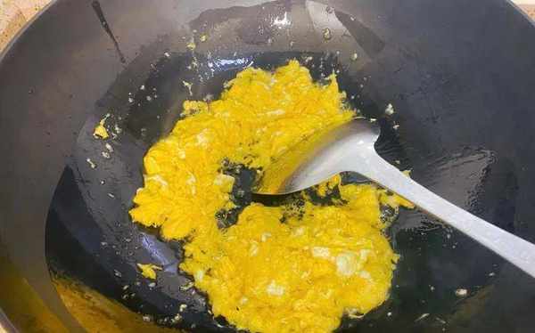 2.炒鸡蛋:碗里打入3个鸡蛋,加一勺盐后搅散。起锅热油,倒入蛋液后用筷子炒散,炒成鸡蛋碎;