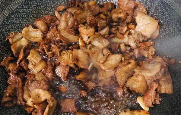 4.肉片煸炒好后,加入生抽、老抽酱油翻炒均匀,这时的肉片就很漂亮了,酱油起提色增香的作用;