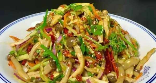食材:白玉菇、洋葱、黄瓜、胡萝卜、大蒜、香葱、香菜、干海椒、白糖、熟白芝麻、花生米