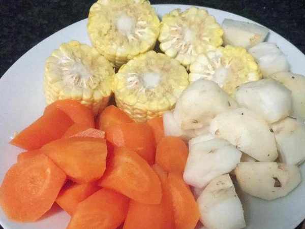 第三步:玉米去皮洗净切块,胡萝卜洗净切块,洋葱去皮切块,姜去皮切块。
