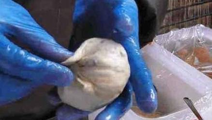 除开面皮其他的都是现做现卖的,将面团拿下一点在里面放上馅料,其实这些馅料是可以供给顾客选择的,自己喜欢就成。将馅料放到包子面皮上就包好。农村女子在街边卖“奇特包子”,五元一个,每天收入1000多