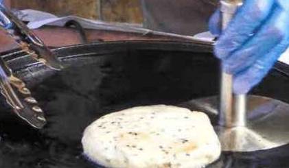 然后就是放到煎锅上煎,用小工具就它压扁一点,这样才好熟。这样五元一个,尝过之后的确是香。农村女子在街边卖“奇特包子”,五元一个,每天收入1000多