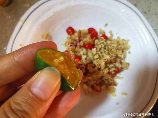 第四步:沙姜切末,小米辣切丁,放入碗中,捏入少许青柠檬汁。
