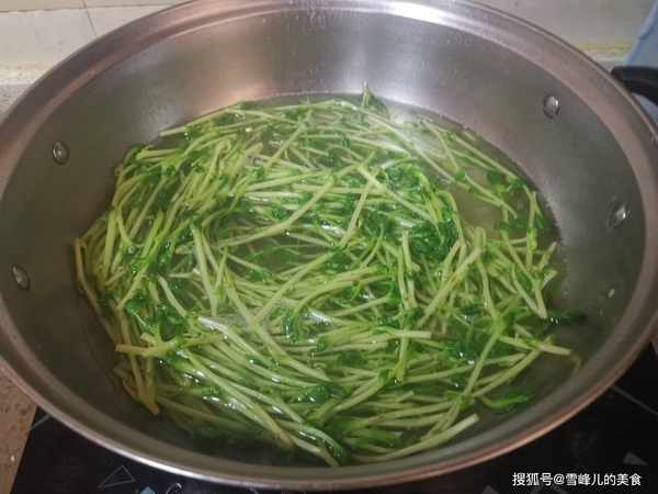 第二步:我们先把豌豆苗洗净,放到开水中汆烫后捞出。汆烫的时间不要太久,变得翠绿后立刻捞出即可。