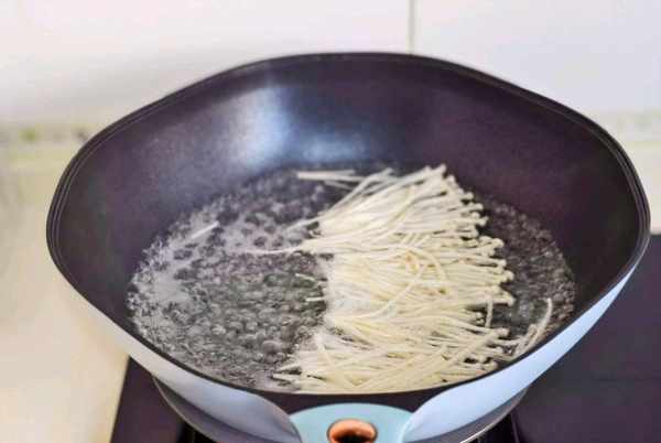 2、把金针菇的根部切除不要,洗净后备用。在锅中加入适量的清水烧开,水开后把金针菇焯熟捞出,放在一旁备用。