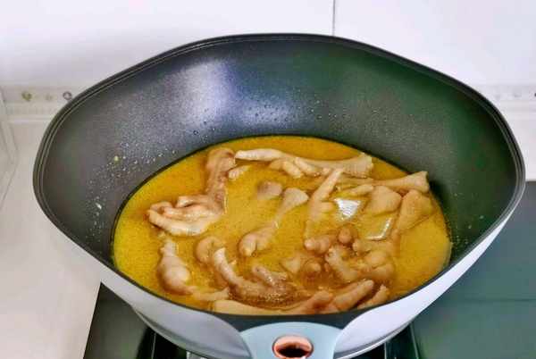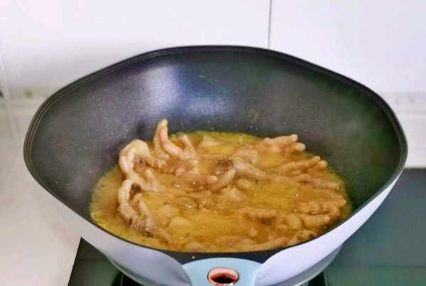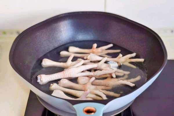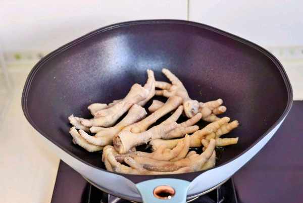 5、锅中加入少许食用油加热,油热后把鸡爪倒进锅中。(注意,鸡爪上如果有水下锅后会溅油,为了避免大家烫伤建议大家用厨房纸擦拭一下鸡爪的表面,只要没有水分,热油下锅后翻炒就很安全。)
