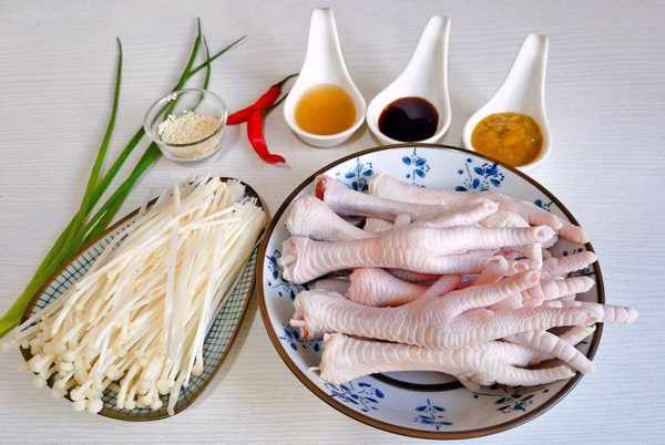 1、准备一斤新鲜的鸡爪,将买回家的鸡爪去除指甲,然后洗净备用,再准备1小把金针菇,一会放在菜里味道也很香。
