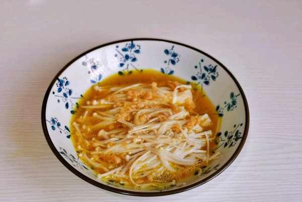 9、将煮好的金针菇铺在碗底,然后倒上一些煮鸡爪时的底汤,再把炖好的鸡爪摆在金针菇上,这道蒜蓉金汤鸡爪就完成啦,强烈推荐给大家,觉得不错的朋友一定要试试哦!