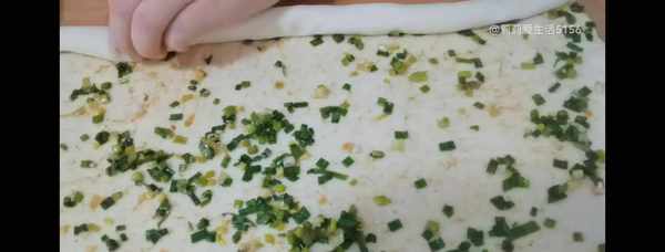 将调制好的葱花舀到面片上,均匀地涂抹,不放过每一个角落。