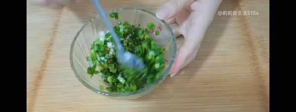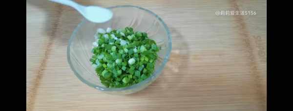 面团醒发的过程中呢,咱们来切点小葱花,切好后放到碗里面,撒一点盐,来一勺十三香,再来两勺秘制葱油,其实就是油烧热放入葱炸制后留下的油啦,搅拌一下,非常的香,浓浓的葱油香味。
