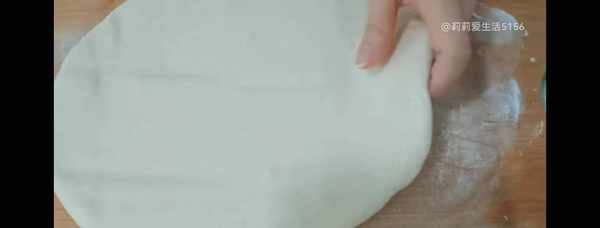这个时候面团也发酵好了,案板上撒上干面粉,将发酵好的面团放到案板上,揉几下排气,按压成大圆饼,用擀面杖擀成大薄片。