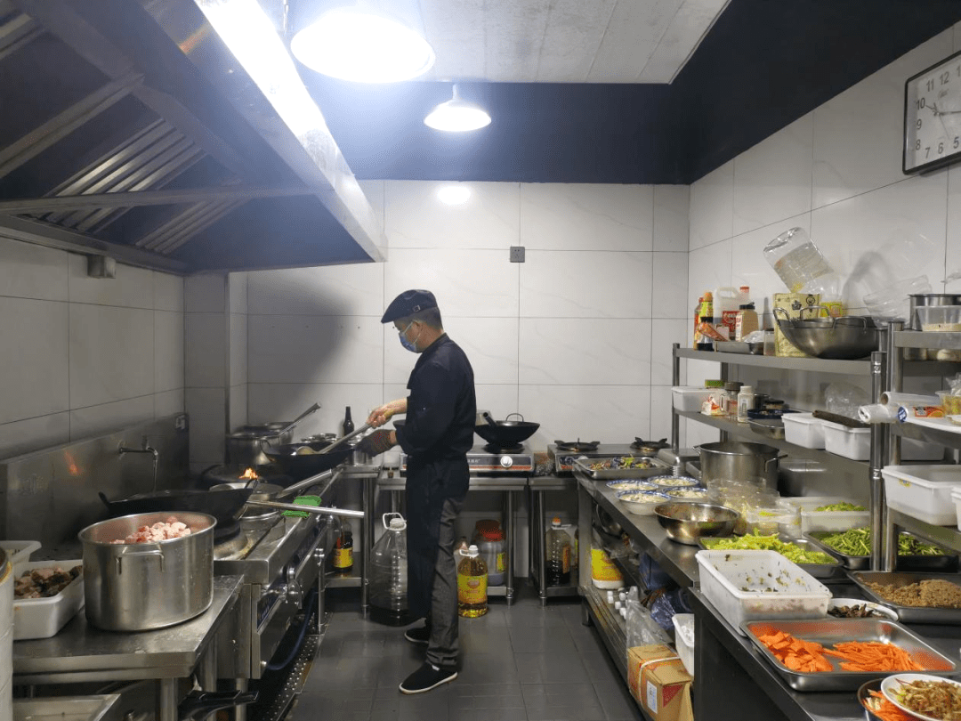 后厨环境整洁,物品摆放整齐有序