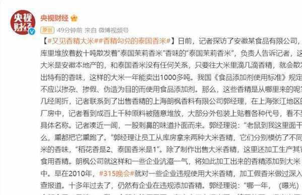 今年315第一个曝光的就是加了香精的泰国香米,根本不是产自泰国,而是用安徽本地产的普通大米,加了香精后冒充泰国香米。