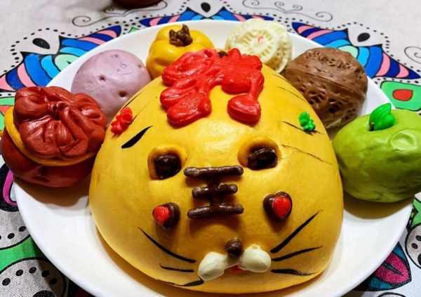 大姐非常擅长做面点,想着这一次家里来了许多小朋友,于是做一盘美美的面食吧。她先用玉米馒头做成了一个圆形状,然后给这个馒头做了眼睛、还一边画了三根胡须,仔细一看,这不就是一个惟妙惟肖的小老虎吗?为了更生动形象,大姐还用不同颜色的面团给老虎做了一顶帽子,看着非常喜庆。