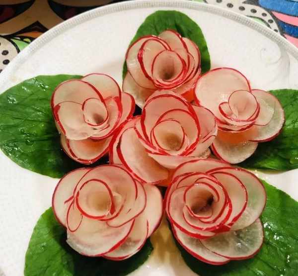 其次是这一盘红皮萝卜,明明成本只有两块钱,被大姐这么一烹饪,直接成了吃不起的样子。大姐先把萝卜放到水里煮熟,然后将萝卜一片一片地削好,接着用几片焯过水的青菜叶放到盘子里打底,然后在青菜叶上面,把萝卜片摆成了一朵朵花的形状,红色的萝卜皮成了自然的花边,看着就赏心悦目。