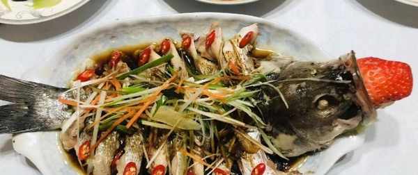 再看这一道蒸鲈鱼吧。先把鲈鱼清洗干净,把鲈鱼从中间剖开,两边的鱼肉都用刀切成条,然后整齐地铺在碗底,就像是。在熬油一样出锅以后,大姐还在每一片鱼肉上,用红辣椒点缀,还剥了一颗草莓塞在鱼嘴里,既好看又好吃。