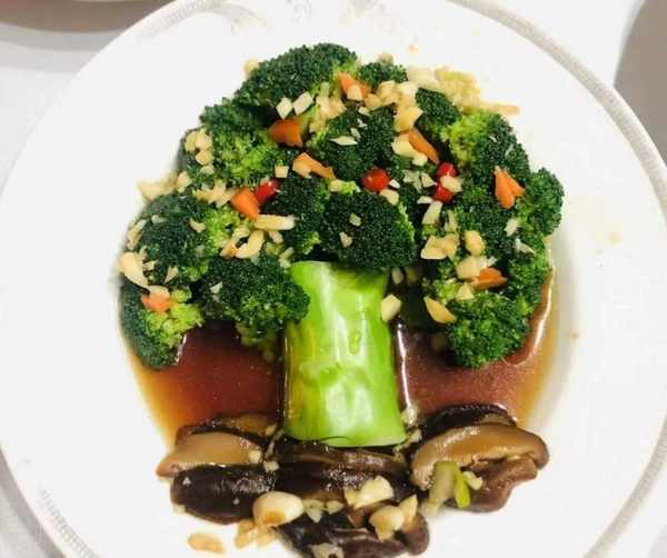 大姐还喜欢做西兰花。她先把西兰花用水焯熟,留下西兰花的根茎作为树干,再把煮熟的西兰花一朵一朵地摆在树干上,然后将料汁淋在西兰花上面,看起来就像一棵栩栩如生的大树;大树底下的“泥土”是用香菇做的,这颜色、这形状,是不是非常应景呢?